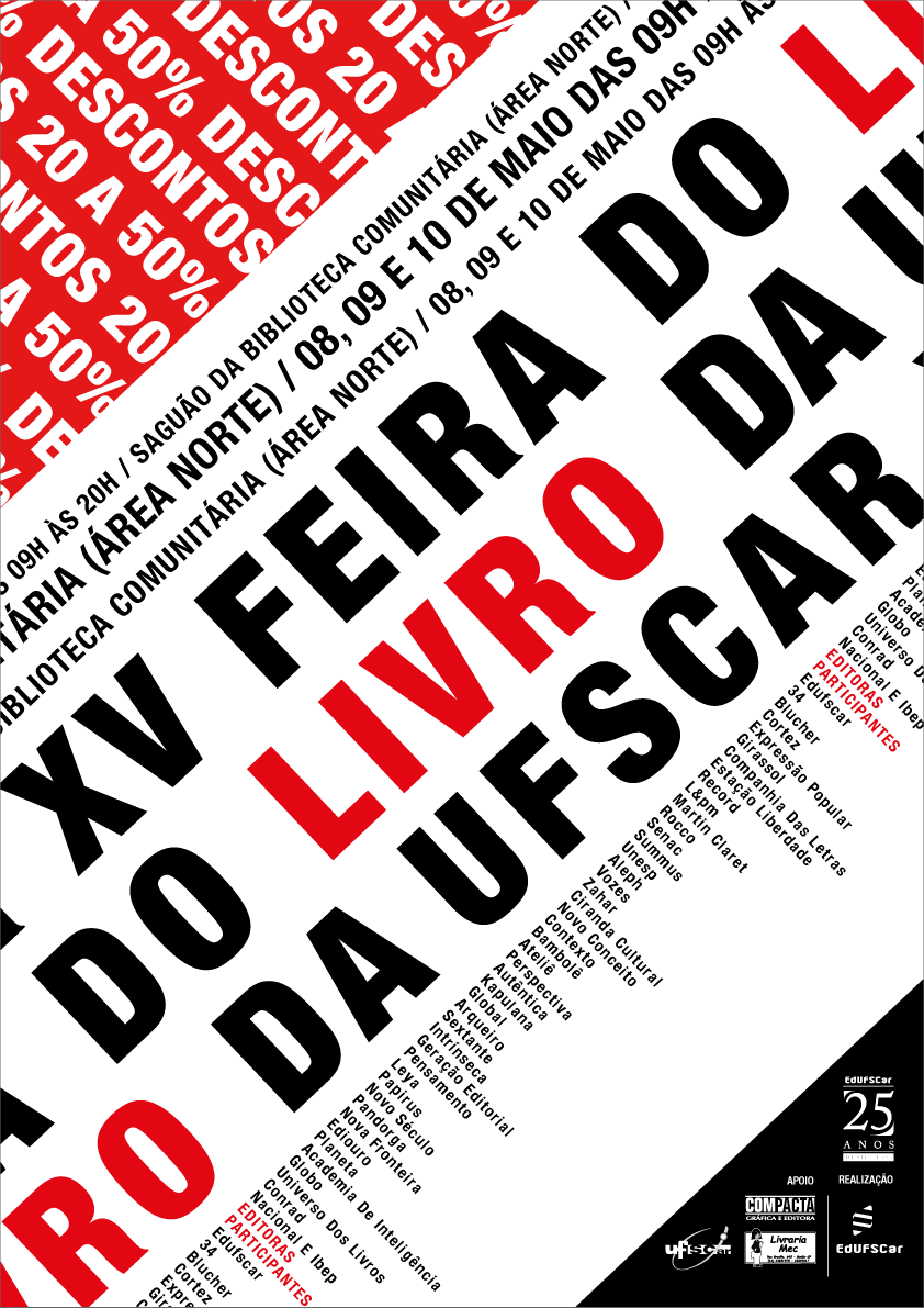 A EdUFSCar realiza entre os dias 8 e 10 de maio a sua XV Feira do Livro. Além da presença de editoras universitárias e comerciais oferecendo descontos de até 50%, a Feira também conta com uma programação cultural, o que inclui oficinas e palestras. Todas as atividades são gratuitas.